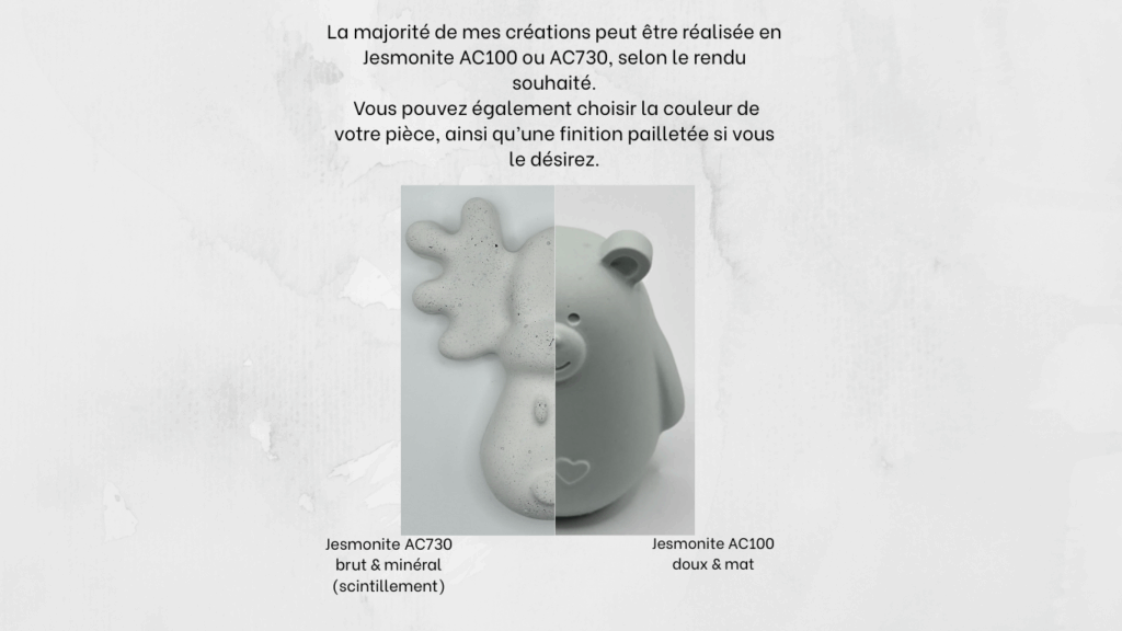 Toutes les pièces sont fabriquées en Jesmonite, un matériau né en Angleterre dans les années 1980. À l’origine utilisée dans le design et l’architecture, la Jesmonite séduit aujourd’hui les artisans pour sa texture soyeuse, sa solidité et son aspect minéral.