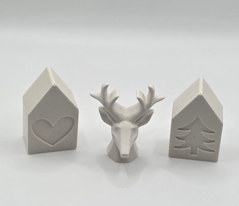 Mini décor en jesmonite AC100 : deux petites maisons et un renne, doux et minimalistes.